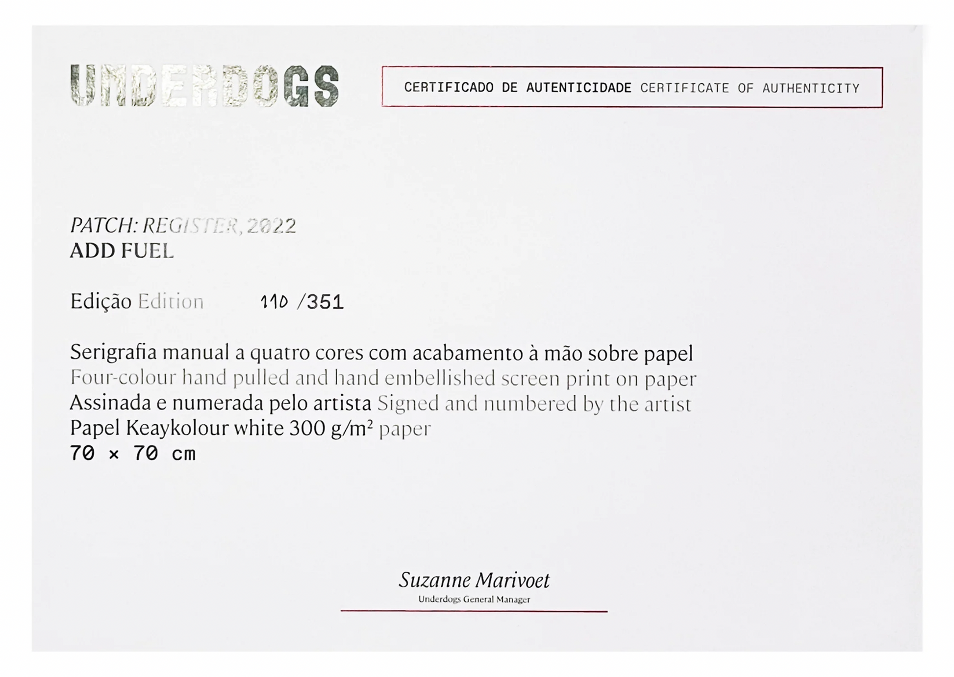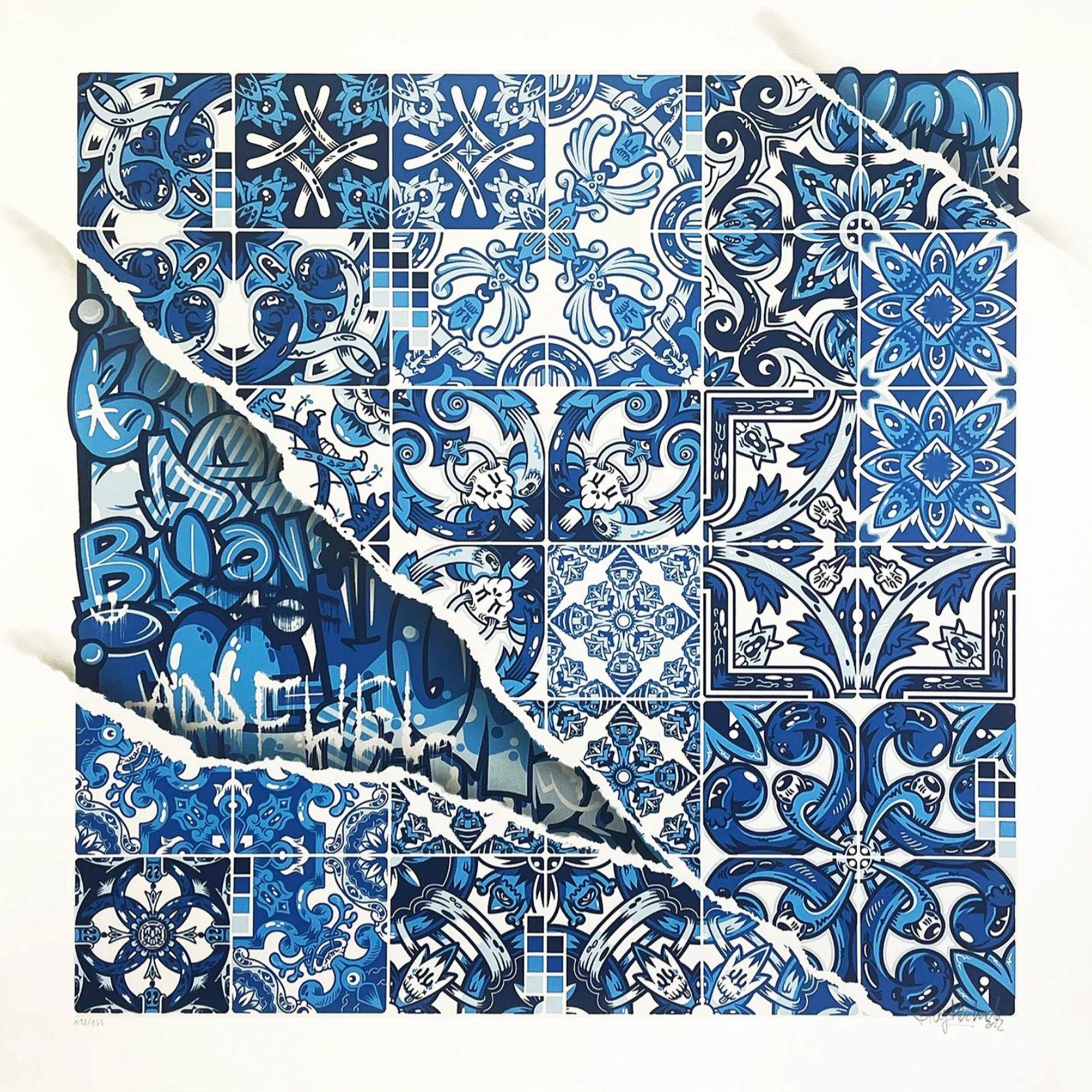 Add Fuel is Portuguese visual artist and illustrator Diogo Machado (b. 1980). A former graphic designer, his recent artistic practice has been focused on reinterpreting and playing with the language of traditional tile design, and that of the Portuguese tin-glazed ceramic azulejo in particular. Blending traditional and contemporary elements, his original vector-based designs and stencil-based street art reveal an impressive complexity and a masterful attention to detail.